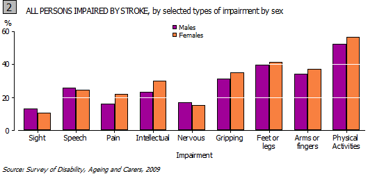 Of the 381,400 people who have suffered a stroke, 35% have at least one impairment as a result of that stroke which will last for six months or longer. Males were more likely to experience impairment as a result of a stroke (37%) than females (33%).