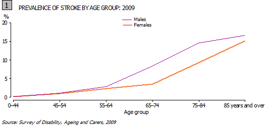 In 2009, an estimated 381,400 Australians (1.8% of the total population) reported they had suffered a stroke. Older people were more likely to have suffered a stroke, with 264,900 people (or 69% of people reporting having suffered a stroke) being aged 65 years or older. Males were also more likely to have reported having had a stroke, with 209,300 or 55% of people reporting having suffered a stroke, being male.