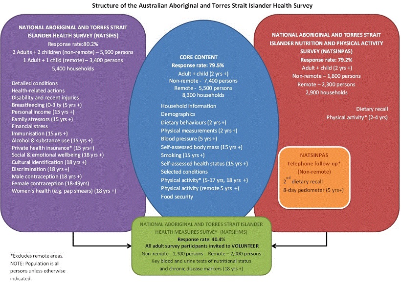 All Aboriginal and Torres Strait Islander people aged 18 years and over who were selected in either the NATSIHS or NATSINPAS were also invited to participate in the voluntary NATSIHMS component. The following diagram shows how the various components combine to provide comprehensive health information for the Aboriginal and Torres Strait Islander population. The contents (and age of respondents by topic) for each component survey are listed below.