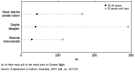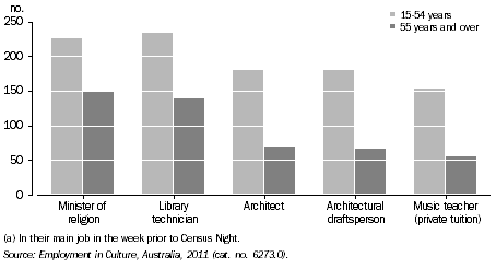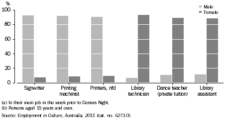 OVERVIEW According to the 2011 Census, 5,796 persons in Tasmania had a cultural occupation as their main job. This was 3% of all persons employed in Tasmania. The highest employing cultural occupations were ministers of religion (378), library technician (373) and graphic designer (330). The occupations with the largest number of persons employed nationally were graphic designers and ministers of religion. Of all persons employed in cultural occupations nationally, 2% resided in Tasmania. The cultural occupation with the largest proportion of employed persons in Tasmania was gallery or museum technician (10%). Less than 1% of dancer or choreographers, actors, make-up artists, fashion designers and multimedia designers in Australia resided in Tasmania. EMPLOYMENT BY SEX Of persons employed in cultural occupations in Tasmania, 3,082 (53%) were male and 2,714 (47%) were female. There were also more males than females employed in cultural occupations nationally. The cultural occupations employing 50 persons or more with the largest proportion of males were signwriters (92%), printing machinists (91%), printers, nfd (91%), web developers (84%), architectural draftspersons (81%) and architects (81%). The same cultural occupations had the largest proportion of males nationally. The cultural occupations employing 50 persons or more with the largest proportion of females were library technicians (93%), dance teachers (private tuition) (89%), library assistants (88%) and librarians (83%). The same cultural occupations had the largest proportion of females nationally. PERSONS EMPLOYED IN SELECTED CULTURAL OCCUPATIONS(a)(b), Tas., 2011 EMPLOYMENT BY AGE Persons aged 15 to 24 years made up 9% of persons employed in cultural occupations in Tasmania, which was similar to the national average of 10%. The cultural occupations with the largest number of persons aged 15 to 24 years were music teacher (private tuition) (43), graphic designer (39) and musician (instrumental) (29). Graphic designer and music teacher (private tuition) were two of the three highest employing cultural occupations for persons aged 15 to 24 years nationally. PERSONS EMPLOYED IN SELECTED CULTURAL OCCUPATIONS(a), By age, Tas., 2011 The cultural occupations with the largest number of persons aged 55 years and over in Tasmania were minister of religion (150), library technician (139), architect (69), architectural draftsperson (66) and music teacher (private tuition) (56). The cultural occupation employing the largest number of persons aged 55 years and over nationally was minister of religion. PERSONS EMPLOYED IN SELECTED CULTURAL OCCUPATIONS(a), By age, Tas., 2011 Of those cultural occupations that have more than 50 persons aged 55 years and over, painter (visual arts) (48%) had the largest proportion of persons in Tasmania, followed by author (44%), picture framer (43%) and librarian (41%). Persons aged 55 years and over accounted for 25% of those employed in cultural occupations in Tasmania, which was higher than the national average of 18%.