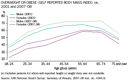 In 2007-08, a higher proportion of males aged 18 years and over were overweight or obese (63%) than were females (48%). These overweight/obesity rates were both up five percentage points on the 2001 results. These estimates are based on people's self reported height and weight.