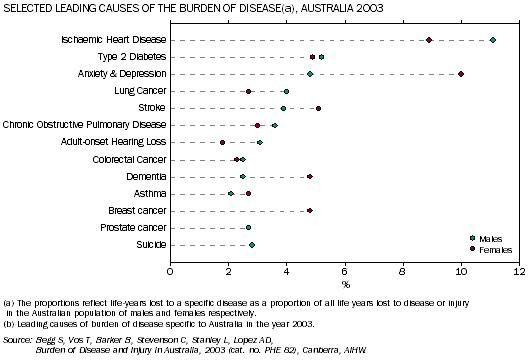 Cancer, cardiovascular disease and mental disorders were the leading causes of total burden of disease and injury in Australia. The burden experienced as a result of ischaemic heart disease was 11% of the total burden for males and 9% of the total burden for females. This has decreased since 1993 when the burden experienced as a result of this disease was 15% of the total burden for males and 12% of the total burden for females.