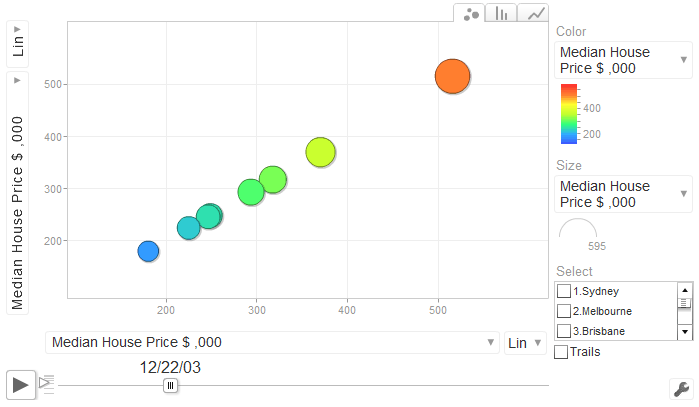 Each Australian capital city is represented by a bubble and it's colour and size is related to the median house price.