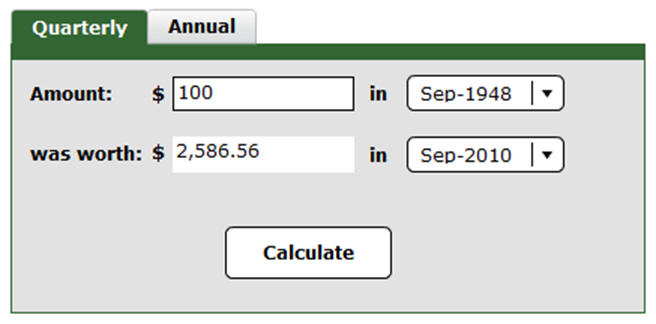 Enter two dates into this tool and see how the purchasing power of money has changed over time.