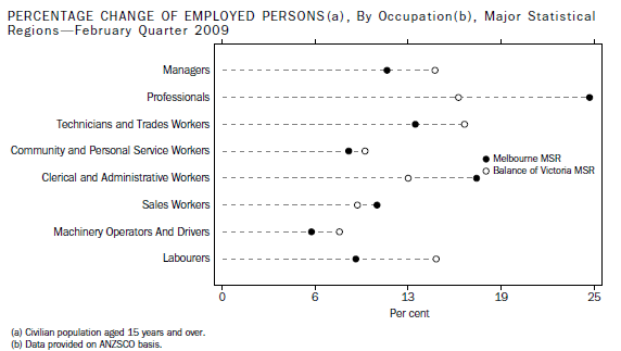 In February quarter 2009, in the Melbourne MSR, almost a quarter of people were employed as Professionals (24.7%), with Clerical and Administrative Workers (17.1%) and Technicians and Trades Workers (13.0%) being the next largest groups. In the Balance of Victoria MSR, the highest proportion of people were employed as Technicians and Trades Workers (16.3%) followed by Professionals (15.9%), Labourers (14.4%) and Managers (14.3%).