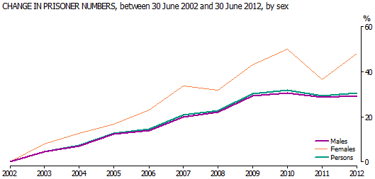 Between 2002 and 2012, the total number of prisoners increased 31%, from 22,492 to 29,381. Over the same period, the number of male prisoners increased 29% (from 21,008 to 27,182) and the number of female prisoners increased by 48% (from 1,484 to 2,199). (Table 2.2)