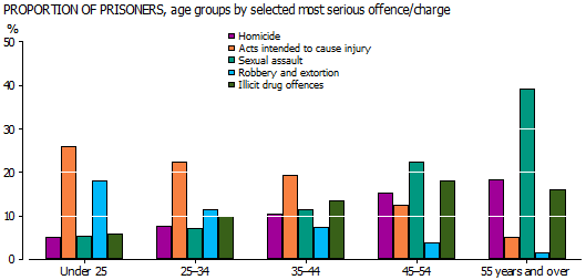• prisoners aged 55 years and over and 45-54 had a higher proportion of prisoners imprisoned for sexual assault than for any other age group (39% and 22% respectively);