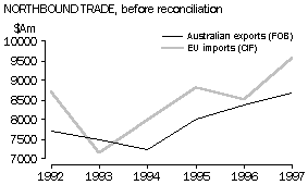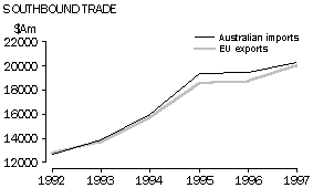 Table A shows the value of Australian exports to the EU and EU imports from Australia. The value of EU recorded imports exceeded that of Australian recorded exports by at least 10% in all years from 1992 to 1997 except 1993 and 1996. In 1993 the value of Australian recorded exports was 4% higher than the EU recorded imports in 1993, while in 1996 the EU recorded imports were 2% higher than Australian recorded exports. EU import figures are expected to be significantly higher than Australian export figures since the cost of overseas freight and insurance is included in EU import values but excluded from Australian export values. Data for all years except 1993 and 1996 were broadly in line with this expectation. Table A. Northbound trade