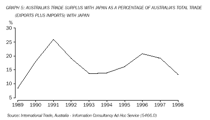 Japan is still Australia's most important trading partner although over the past 10 years its relative significance, both as an export destination and as a source of Australian imports, has declined. In each of the years from 1989 to 1998, Japan was Australia's largest trading partner. The value of Australia's total trade (exports plus imports) with Japan increased by 34% – from $23 billion in 1989 to nearly $31 billion in 1998. Japan's share of Australia's total trade, however, has decreased significantly – from 23% in 1989 to 17% in 1998. While Australia's total exports increased by 89% over the period, our exports to Japan increased by only 40%. Similarly, while our total imports increased by 87%, our imports from Japan increased by only 27%. In each of the last 10 years, Japan was Australia's most important export destination and the second largest import supplier, after the United States of America. In 1998 Japan was the destination for 20% of our exports and supplied 14% of our imports (see Graphs 2 and 3). From Japan's perspective, Australia is significantly less important as a trading partner for both merchandise exports and merchandise imports. In the year ending June 1998, Australia was the destination for only 2% of Japan's exports and the source of 4% of Japan's imports – a small decrease over the corresponding percentages for 1989 of 3% and 5% respectively1. AUSTRALIA'S BALANCE OF TRADE WITH JAPAN Australia has recorded merchandise trade surpluses with Japan in each of the last 10 years. The surplus with Japan grew from $2 billion in 1989 to $6 billion in 1991 before declining to just under $4 billion in 1993. From 1994, the surplus steadily increased once again, exceeding $5 billion in 1997 before falling back 24% to a $4 billion surplus in 1998, due largely to increasing imports of passenger motor vehicles from Japan. As a proportion of the value of total merchandise trade (exports plus imports) between Australia and Japan, the trade surplus with Japan increased from 8% in 1989 to peak at almost 26% in 1991. The surplus subsequently showed a steady decline to a little under 14% in 1993 and 1994, before steadily increasing once again to 21% in 1996. By 1998, however, the surplus had fallen to just 13% (see Graph 5). The continuing trade surplus with Japan contrasts with Australia's persistent trade deficit with the rest of the world which grew 79% from a little under $7 billion in 1989 to $12 billion in 1998. Continuing trade deficits with the United States of America and the European Union have been only partly offset by surpluses with Japan as well as with the Republic of Korea (see Graph 6). 1999 UPDATE In the March quarter 1999, Australia's merchandise trade surplus with Japan was $600 million, a significant decline from the surplus of $1,155 million recorded for the corresponding quarter in 1998. The fall in the surplus since the December quarter 1998 is a result of a significant decline in Australia's total merchandise exports to Japan (mainly wool and coal). Between the March quarters 1998 and 1999, exports to Japan declined 8% – from $4,206 million to $3,879 million, while imports from Japan increased by 7% – from $3,052 million to $3,279 million (see Graph 7). More details on the latest 3 months trading with Japan can be obtained by contacting any of the ABS offices shown on the back of this publication. COMMODITY ANALYSIS OF TRADE WITH JAPAN Tables D and E show Australia's trade flows with Japan for the two years 1989 and 1998 for major selected commodities, the share of total trade with Japan represented by each commodity in 1989 and 1998, and the proportion of Australia's world wide trade in each of the major commodities traded with Japan. Some of the data in Tables D and E are affected by confidentiality restrictions. In making comparisons at the commodity level it should be noted that, in Australia's international trade statistics, confidential commodity data are not reported against the commodity, but rather are classified to SITC 98 – combined confidential items of trade. While confidentiality restrictions do not affect total import and export statistics, they do affect data comparability at the commodity level. In particular, it should be noted that Australia's export commodity statistics with Japan are significantly affected by confidentiality restrictions. EXPORTS Over the 10 years to 1998, Australia exported mainly primary products to Japan. Mineral fuels and lubricants (SITC 3) was the largest group of commodities by value exported from Australia to Japan from 1989 to 1998, accounting for nearly a third of Australia's exports to Japan over the decade. In 1998, exports of mineral fuels and lubricants accounted for $5 billion (28%) of Australia's total exports to Japan – up 56% on the $3 billion (25%) in 1989, but down on the 35% share achieved in the early 1990's.
