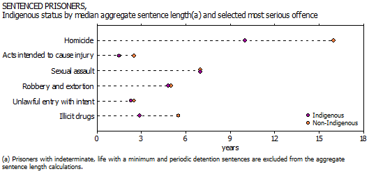 SENTENCED PRISONERS Expected time to serve Expected time to serve takes into account the earliest date of release for sentenced prisoners. Excluding prisoners with indeterminate, life without a minimum, and periodic detention sentences, the median expected time to serve for sentenced Aboriginal and Torres Strait Islander prisoners was 1.3 years (15 months). Median expected time to serve was highest for the offence of homicide (8.0 years or 96 months) followed by sexual assault (5.0 years or 60 months). For the non-Indigenous prisoner population the median expected time to serve was 2.3 years (27 months), with a median of 12 years (144 months) for the offence of homicide. (Tables 4.6 and 4.7)