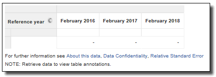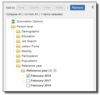 FILE STRUCTURE AND CONTENT However, at least one category (reference year) of the mandatory field must be present in a table for TableBuilder to retrieve data. Not Applicable Categories Most data items included in the TableBuilder file include a 'Not applicable' category. The classification values of these 'Not applicable' categories, where relevant, are shown in the data item list in the Downloads tab. The 'Not applicable' category generally represents the number of people who were not asked a particular question or the number of people excluded from the population for a data item when that data were derived (e.g. Hours usually worked in main job is not applicable for unemployed persons or persons not in the labour force). Table Populations The population relevant to each data item is identified in the data item list and should be kept in mind when extracting and analysing data. The actual population count for each data item is equal to the total cumulative frequency minus the 'Not applicable' category. Generally, some populations can be 'filtered' using other relevant data items. For example, if the population of interest is 'Employed', any data item with that population (excluding the 'Not applicable' category) could be used. Zero Value Cells Tables generated from sample surveys will sometimes contain cells with zero values because no respondents that satisfied the parameters of a particular cell in a table were in the survey. This is despite there being people in the general population with those characteristics. This is an example of sampling variability which occurs with all sample surveys. Relative Standard Errors cannot be generated for zero cells.
