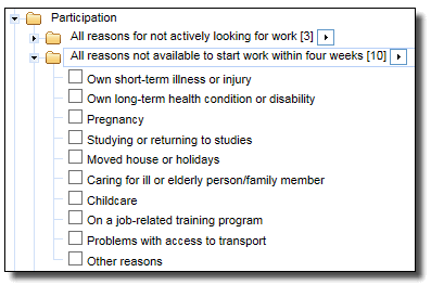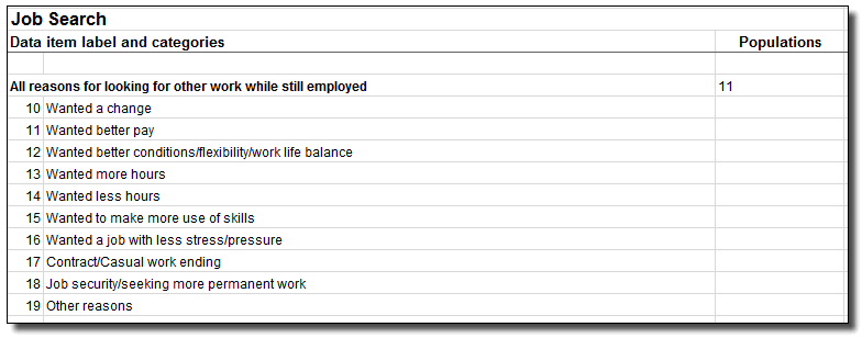 Perturbation Effects To minimise the risk of identifying individuals in aggregate statistics, a technique is used to randomly adjust cell values. This technique is called perturbation. Perturbation involves small random adjustments of the statistics and is considered the most satisfactory technique for avoiding the release of identifiable statistics while maximising the range of information that can be released. These adjustments have a negligible impact on the underlying pattern of the statistics. The introduction of these random adjustments result in tables not adding up. As a result, randomly adjusted individual cells will be consistent across tables, but the totals in any table will not be the sum of the individual cell values. The size of the difference between summed cells and the relevant total will generally be very small. Please be aware that the effects of perturbing the data may result in components being larger than their totals. This includes determining proportions. Table suppression Some tables generated within TableBuilder may contain a substantial proportion of very low counts within cells (excluding cells that have counts of zero). When this occurs, all values within the table are suppressed in order to preserve confidentiality. The following error message below is displayed (in red) at the bottom of the table when table suppression has occurred. ERROR: The table has been suppressed as it is too sparse ERROR: table cell values have been suppressed COUNTING UNITS AND WEIGHTS Weighting is the process of adjusting results from a sample survey to infer results for the total population. To do this, a 'weight' is allocated to each record. The weight is the value that indicates how many population units are represented by each sample unit. To produce estimates for the in-scope population you must use a weight field in your tables. In TableBuilder they can be found under the Summation Options category in the left hand pane under the applicable level. If you do not select a weight field, TableBuilder will apply 'Person weight' by default. This will give you estimates of the number of persons. If you are estimating the number of persons with certain characteristics (e.g. 'Number of non–school qualifications completed') the weight listed under the category heading 'Person level weighting' must be used. When creating a table a default Summation Item will need to be the Reference year as this item will provide data for the relevant year. This item will then be used for time-series purposes as future data becomes available. SELECTING DATA ITEMS FOR CROSS–TABULATION The Person level contains a range of data items detailing the characteristics of the respondent including PJSM, demographic, education, labour force and population variables. Populations and Data items When adding a data item to a table, an associated population should also be used to ensure correct data is retrieved from TableBuilder. For example, the data item All reasons for looking for other work while still employed is only applicable to population group 11 Persons employed more than a year in their current job who looked for work in the previous 12 months (as per the image below), so when using this item in a table only that population should be used. Similarly, if users want to add multiple data items to a table they should ensure that these data items are applicable to the same population group. For more information about data items and applicable populations, users should refer to the PJSM TableBuilder Data Items List available from the downloads tab. Cross-tabulating Data items on the same level Cross-tabulating data from the Person Level with other data items from the same level will produce data about people. For example, cross-tabulating the geographic variable 'State or territory of usual residence' by the 'Hours usually worked in main job' produces a table showing the number of people in each region by the hours that they usually work each week in their main job. MULTI–RESPONSE DATA ITEMS A number of the survey's data items allow respondents to report more than one response. These are referred to as 'multi–response data items'. An example of such a data item is pictured below. For this data item respondents can report all the difficulties they had in finding work. When a multi–response data item is tabulated, a person is counted against each response they have provided (e.g. a person who responds 'Studying or returning to studies' and 'Caring for ill or elderly person/family member' and 'Problems with access to transport' will be counted once in each of these three categories). As a result, each person in the appropriate population is counted at least once, and some persons are counted multiple times. Therefore, the total for a multi–response data item will be less than or equal to the sum of its components. For more information on definitions and concepts that apply to the data items in this file, please refer to Participation, Job Search and Mobility, Australia (cat. no. 6226.0) and Labour Force, Australia (cat. no. 6202.0). Document Selection These documents will be presented in a new window.