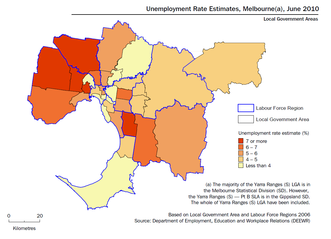 The Australian Government Department of Education, Employment and Workplace Relations (DEEWR) produce unemployment rate estimates at Statistical Local Area (SLA) level, using information derived from the ABS Labour Force Survey (LFS), supplemented by small area data from the ABS Census of Population and Housing and Centrelink.