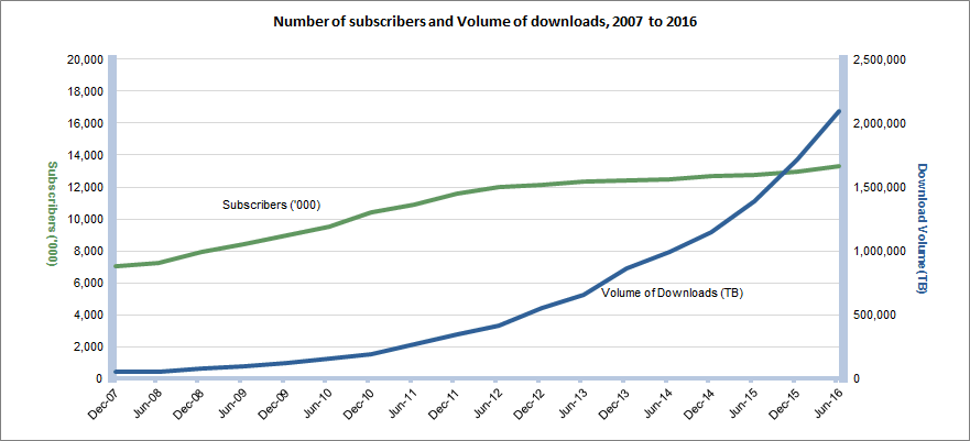 The following graph shows the number of internet subscribers and the volume of data downloaded for the reporting periods between December 2007 and June 2016.
