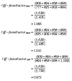 Sales and service income and other expenses factors were not generated for Education and training and Health care and social assistance (Divisions P and Q respectively), as the information is not collected by QBIS (see Scope and Population above). For each data item, quarterly QBIS data reported by the subset of businesses established above were summed to give an aggregate value for each in scope ANZSIC subdivision. These aggregate quarterly values were then used to create factors that model the impact of off-June reporting for each of the four data items by each in scope subdivision. To calculate each factor, a ratio of the data reported during the standard financial year and the relevant off-June time-period was generated, by summing data from the four quarters of the standard financial year and dividing this by the summed annualised data from the four quarters of the relevant off-June reporting period, as described by Equation 1. EQUATION 1. CALCULATING OFF-JUNE FACTORS where Q is quarterly QBIS data aggregated by industry subdivision for the subset of businesses identified above. Since inventories are stock variables (that is, represent a quantity existing at a particular point in time) the formulae for deriving inventories factors differed slightly, as described by Equation 2. EQUATION 2. CALCULATING OFF-JUNE INVENTORIES FACTORS Factors were produced for opening and closing inventories, by type of inventory. The types of inventories specified were raw materials inventories and finished goods inventories (including work-in-progress). The factors generated give an indication of the variability in trading conditions between off-June reporting periods and the standard Australian financial year. A factor of 1 indicates no variability, implying there is no effect of off-June reporting on estimates published in Australian Industry (cat. no. 8155.0). Conversely, the further a factor lies from 1, the greater the impact of off-June reporting on industry estimates. Where there were five or less contributing QBIS businesses in an ANZSIC subdivision, it was considered that data was of insufficient quality to model accurately. An example of the calculation of factors for Subdivision 14, Wood product manufacturing is provided below. Quarterly sales and service income estimates derived from in-scope QBIS data (see Table 3) were utilised to produce 'off-June' factors (see Equation 3) to be applied to EAS estimates of sales and service income.