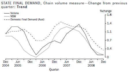 In December quarter 2008, the trend estimate for Victorian final demand, in volume terms, was $66,192 million, an increase of 0.1% from September quarter 2008. This was the same as the trend growth for New South Wales (0.1%) and below the growth in Australian domestic final demand over the same period (0.3%).