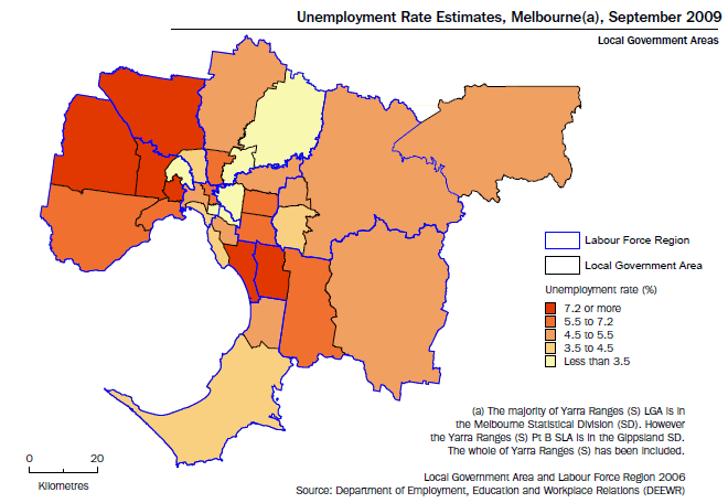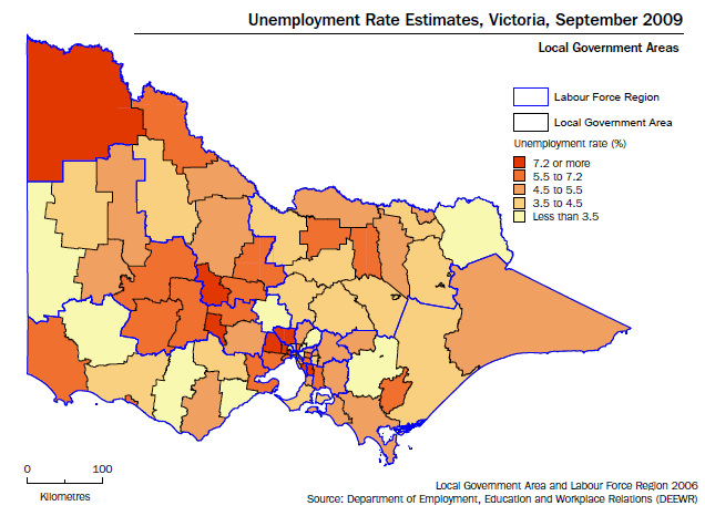 In September quarter 2009, the highest unemployment rates were recorded in the LGAs of Greater Dandenong (10.4%), Central Goldfields (9.6%) and Brimbank (8.8%), while the lowest unemployment rates were recorded in Nillumbik (1.7%), South Gippsland (2.8%) and Macedon Ranges (2.8%). In September quarter 2009, 53.2% of Victorian LGAs recorded an unemployment rate of less than or equal to 5.0%.