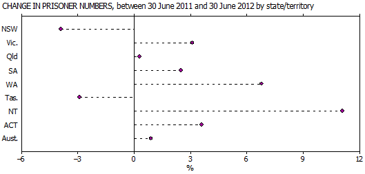 Between 2011 and 2012, the prisoner population increased in all states and territories, except New South Wales and Tasmania. The highest proportional increases in prisoner numbers were for the Northern Territory (11%), Western Australia (7%) and the Australian Capital Territory (4%). The prisoner population decreased by 4% in New South Wales and by 3% in Tasmania between 2011 and 2012. (Based on Table 3.5)