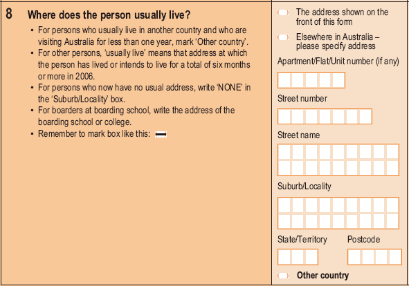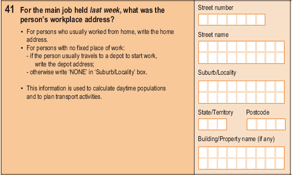 For the 2006 Census, the question asking for the person’s workplace address was expanded to include building/property name.