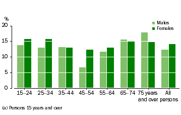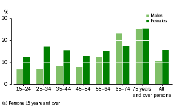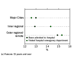 HOSPITAL ADMISSIONS AND EMERGENCY VISITS On the other hand, as shown in Figure 1.4, patterns of visiting an emergency department were quite similar for men and women except for the 45-54 year old age group. 1.4 Visited hospital emergency department in last 12 months (a), by Age and Sex (Differences between men and women aged 75 years and over are not statistically significant (see Technical Note). See Table 1.2 for more detail) WA and Tasmania (16%) had the highest rates of people being admitted to hospital and NT had the lowest (10%) (keeping in mind that the survey did not go to very remote communities, which accounts for approximately 24% of the population of the NT). This was similar for rates of emergency visits, with people in WA (16%) and SA (14%) reporting the most visits to an emergency department in the previous 12 months and people in the NT reporting the least (12%). Survey results show that relative disadvantage had some effect on rates of hospital admissions and emergency visits. People in areas of most disadvantage reported the most hospital admissions (15%) and they had the highest rate of visiting an emergency department (17% compared with the national average of 13%) (see Table 1.1 for more detail). They were also far more likely to consider their health only fair or poor than people from areas of least disadvantage. These rates may be due in part to age1 . Across the board, people's estimation of their own health status was reflected in rates of both hospital admissions and emergency visits. People who rated their health as fair or poor were more than twice as likely to have been admitted to hospital or to visit an emergency department (27% and 26% respectively) as people who rated their health as excellent, very good or good (both 11%). As shown in Figure 1.5, people in outer regional and remote areas of Australia had the highest rates of being admitted to hospital (15%) and visiting an emergency department (15%). 1.5 Hospital admissions and emergency visits in last 12 months (a), by Remoteness (See Table 1.1 for more detail) References Australian Institute of Health and Welfare 2010. Australia's Health 2010. Australia's Health series no. 12. Cat. no. AUS 122. Canberra: AIHW. (page 315). 1. There are relationships between age and health service usage, and between age and socio-economic status. The SEIFA indices summarise different aspects of the socio-economic conditions of people living in an area. The Index of Relative Socio-economic Disadvantage is derived from Census variables related to disadvantage, such as low income and dwellings without motor vehicles. Patient Experience survey results show that people aged 65 years and over are slightly more likely to live in areas of more disadvantage, and are more likely to rate their health as fair or poor. <back