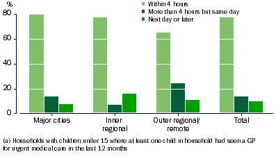 Waiting times for children seeing a GP for urgent medical care were longer for households in outer regional/remote areas, with 65% of households reporting that their children were seen within 4 hours, compared with 77% of households in inner regional areas and 79% of households in major cities (see Figure 7.5).