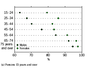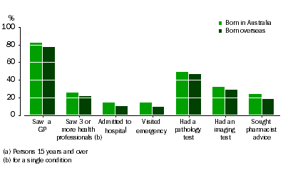 GENERAL PRACTITIONER (GP) In general, people living in major cities were more likely to have seen a GP (82%) than those living in outer regional or remote areas (78%). Across the States and Territories, people living in the ACT were the most likely to have seen a general practitioner (87%) while people living in the NT (76%) and Victoria (79%) were the least likely (see Tables 1.1 and 1.3 for more detail). People who were not born in Australia were a little less likely to have seen a GP than people born in Australia (77% and 82% respectively), a pattern that was repeated across all the health services discussed in this chapter (shown here in Figure 1.2). 1.2 Use of health services in the last 12 months (a), by Country of birth (See Table 1.1 for more detail) Rates of seeing a GP clearly aligned with people's self-perception of their health - more people who felt their health was only fair or poor had seen a GP in the past year (95%) than people who felt their health was generally excellent, very good or good (79%). More details of GP services (for example, prescriptions for medication) are available in Chapter 3. Details of people's experiences of communication with GPs (for example, whether received and understood an explanation of the reasons for prescribing medication) are available in Chapter 5.