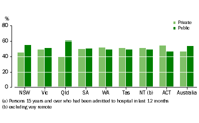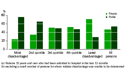 PUBLIC AND PRIVATE PATIENTS 4.2 Treated as public or private patient on most recent admission to hospital (a), by State/Territory (See Table 4.3 for more detail) Almost half of the people living in major cities and inner regional Australia had been treated as private patients on their most recent admission to hospital, compared with around a third of people living in outer regional or remote areas of Australia. Figure 4.3 below shows that the rate of people who had been treated as private patients on their most recent hospital admission was lowest for people living in the areas of most disadvantage. These people were in fact more than three times as likely to have been treated as public patients. The rate of being treated as a private patient steadily increased for people living in less disadvantaged areas, with people living in the least disadvantaged areas more than twice as likely to have been treated as private rather than public patients. 4.3 Treated as public or private patient on most recent admission to hospital (a), by Index of disadvantage (b) (See Table 4.1 for more detail) Younger people (aged between 15 to 34 years) were less likely to have been treated as private patients on their most recent admission to hospital than people aged 35 years and over. Survey results showed a relationship with employment status and self-perception of health on whether or not people had been treated as private patients. Employed people were around one and a half times more likely than people who were unemployed or not in the labour force to have been treated as a private patient (57% compared to 38%). Similarly, people who felt their health was excellent, very good or good were also one and a half times more likely than people who felt their health was fair or poor to have been treated as a private patient. Not surprisingly, people with private health insurance were more likely to have been treated as private patients (76%) than people without private health insurance (8%) on their most recent admission to hospital. However, almost a quarter of people with private health insurance (24% or 298,800 people) chose not to be treated as a private patient on their most recent visit.