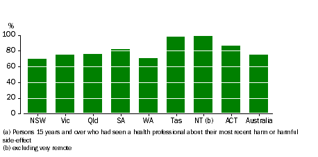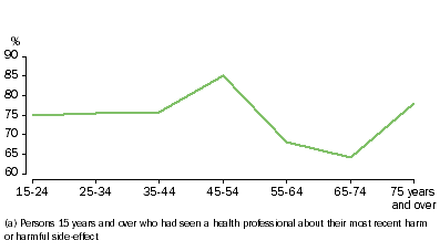 SATISFACTION WITH THE WAY SITUATION WAS HANDLED FOR MOST RECENT HARM OR HARMFUL SIDE-EFFECT 6.5 Satisfied with the way situation was handled for most recent harm or harmful side-effect (a), by State/Territory (See Table 6.2 for more detail) After the age of 35, levels of satisfaction with the way their situation had been dealt with by a health professional were quite varied, with people aged 45 to 54 being the most satisfied and people aged 65 to 74 being the least satisfied. Around three-quarters of people aged 15-34 were satisfied with the way their situation had been handled (see Figure 6.6). 6.6 Satisfied with the way situation was handled for most recent harm or harmful side-effect (a), by Age (See Table 6.1 for more detail) Women (76%) were slightly more likely than men (73%) to have been either satisfied or very satisfied with the way the situation had been handled for their most recent experience of harm or a harmful side-effect.