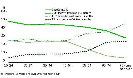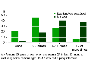 FREQUENCY OF VISITS TO GP Overall, one in ten people who had seen a GP in the past year made 12 or more visits in that time (11% or 1.5 million people). This was highest in areas of most disadvantage, for which the rate of seeing a GP more than 12 times a year (17%) was nearly three times that of people living in areas of least disadvantage (6%). Rates of seeing a GP less than 12 times a year, however, did not differ significantly between levels of disadvantage. People from the Northern Territory had seen a GP less frequently than other Australians - for the most part, three times or less in a year (81% compared with the national average of 61%). Throughout this publication, it can be seen that there is a clear relationship between people's self-assessed health and their use of health services. Figure 3.2 shows that people who rated their general health as fair or poor were more likely to see a GP more frequently than those who rated their health as good or better.
