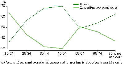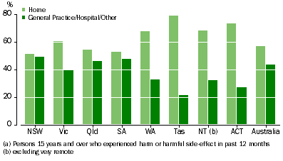 EXPERIENCED HARM OR HARMFUL SIDE-EFFECT 6.1 Where had medication, medical care, treatment or test that caused harm or harmful side-effect (a), by State/Territory (See Table 6.2 for more detail) Around seven out of ten people aged 45 to 54 reported having the medication, medical care, treatment or test that caused harm or harmful side-effects at home. Men were slightly more likely than women to report this. As shown in Figure 6.2, people aged 15 to 24 most commonly reported having the medication, medical care, treatment or test that caused harm or harmful side-effects in a GP clinic, hospital or other location, a pattern that was reversed for people aged 35 to 54. 6.2 Where had medication, medical care, treatment or test that caused most recent harm or harmful side-effect (a), by Age (See Table 6.1 for more detail)