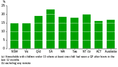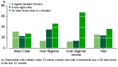 CHILDREN'S VISITS TO GENERAL PRACTITIONERS AFTER HOURS 7.3 Child saw a GP after hours in last 12 months (a), by State/Territory (See Table 7.2 for more detail) Nationally, most visits were at an after hours clinic at a hospital (36%), followed by regular general practices (26%) and late night clinics (24%). This was particularly the case in WA, where more than half the visits were at an after hours clinic at a hospital, and less than ten percent were at a regular general practice. In Victoria, most after hours visits occurred at regular general practices. More children in disadvantaged households had seen a GP in an after hours clinic at a hospital (46% and 54% of households in the two most disadvantaged quintiles, compared with 17% of households in the least disadvantaged quintile). Children from households in the least disadvantaged areas were most likely to have seen a GP at a regular general practice or a late night clinic. Households in outer regional and remote areas of Australia were more likely to have used GP services for their children in after hours clinics at hospitals than other after hours services - 68% of visits compared with 28% reported for major cities, shown here in Figure 7.4. 7.4 Type of service used for after hours GP visits (a), by Remoteness (See Table 7.1 for more detail) Unable to see a GP after hours Nationally, about 1 in 20 households with children under 15 had at least one child who had not been able to see a GP after hours when they needed to in the last 12 months (5% or 108,900 households). The primary reason for this reported by households was that there had been no service available in the area at the time it was needed (64%). This was particularly the case in NSW, where 83% of households reported it as their main reason.