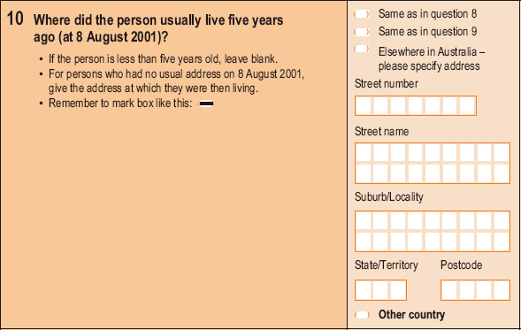 For the 2011 Census, the ABS is considering expansion of the 'Other country' response to require specification of the name of the country at which the person usually lived one and five years ago. This is important for assessing the specific countries from which recent migrants have originated (which may not be the same as their country of birth).