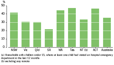 Tasmania had the lowest rate of hospital emergency visits for children (23% of households with children under 15) and WA, NT and Qld had the highest rates (around 32%).