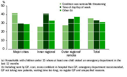 As shown in Figure 7.1, a higher proportion of households in major cities reported taking their child to an emergency department because their child's condition was serious or life threatening than households in other areas of Australia.