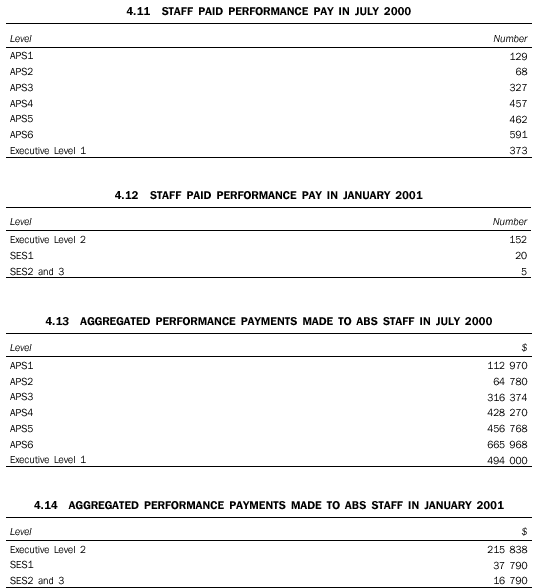 The ABS operates a reward and recognition scheme to recognise exceptional one-off achievements by individuals or workgroups. Rewards under the scheme may be in the form of certificates, hospitality (such as workgroup lunches), prepaid vouchers and cash bonuses. Total expenditure on the scheme in 2000-01 was $121,645.