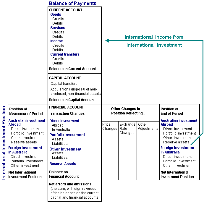 2.4. Viewed more broadly, the international investment position reconciles the stock of investment at two different points in time by showing financial transactions and other changes (non-transaction changes) such as price changes, exchange rate variations and other adjustments that occurred during the period. This is also referred to as a reconciliation statement. Financial transactions which are included in the reconciliation statement are equivalent to the transactions measured in the financial account of the balance of payments. This is illustrated in diagram 2.1 which shows the relationship between the balance of payments and international investment position statements. The column of the diagram shows the accounts of the balance of payments, while the row shows the international investment position. Common to both row and column is the financial account of the balance of payments (called simply ‘transactions’ when presented in an international investment position format). This financial account shows, for the relevant accounting period, the financial transactions which arise from or are the counterparts to the transactions in the current and capital accounts. Correspondingly, it also reflects the change in Australia’s international investment position over the reference period due to those financial transactions.