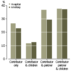 In June 1998, cost was the most common reason given for not having private health insurance. During 1998-99 the average amount paid per year for hospital insurance was $601 for an individual, and for ancillary cover was $239.2 Accordingly, people were less likely to have private health insurance, the lower their family (‘contributor unit’) income. Of contributor units in the lowest income range ($20,000 or less), 17% were covered. The proportion increased with increased income to 73% of those in the highest range ($100,000 or more). This pattern was also observed for ancillary insurance, with the proportion covered ranging from 13% to 62%. Of couples with dependent children, 38% had hospital insurance, as did 37% of couples without dependent children. Single people followed (27%), while lone parents and their dependent children were the least likely to have private hospital insurance (12%). The same ranking was observed for ancillary insurance. There were some differences between types of contributor unit in the relative uptake of ancillary insurance and hospital insurance. Contributor units which included dependent children were as likely to have ancillary cover as to have hospital cover. In contrast, ancillary cover was less common than hospital cover among singles (23% had ancillary insurance) and couples without children (29%). In June 1998, just over a third of the population aged 15 years and over were covered by a government health care card of some kind. People covered by these cards were less likely to have private health insurance than those not covered (22% compared with 46%).3 PROPORTION OF THE POPULATION WITH PRIVATE HEALTH INSURANCE, BY TYPE OF CONTRIBUTOR UNIT, JUNE 1998 Source: Health Insurance Survey, 1998 (ABS cat. no. 4335.0).