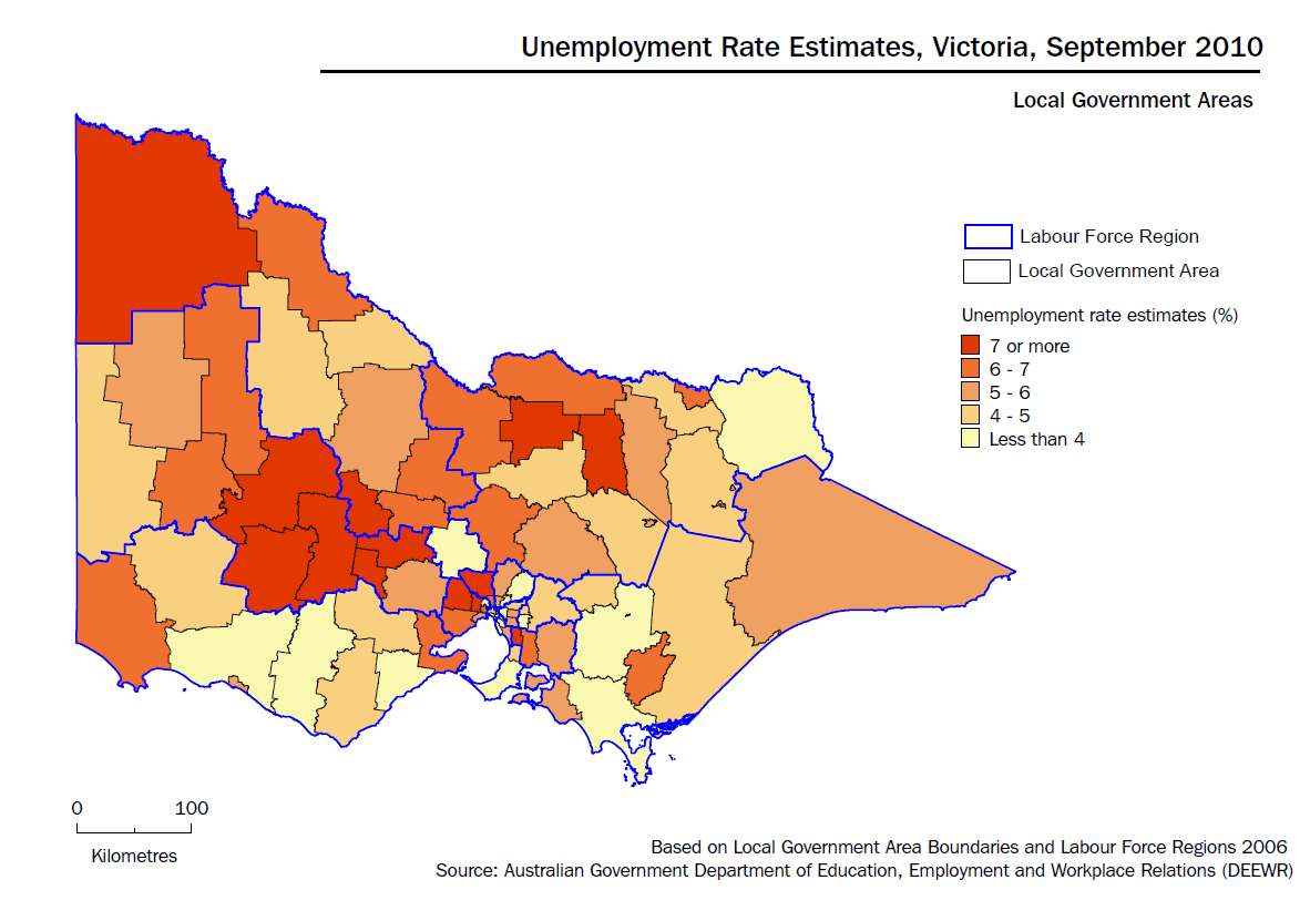 In September quarter 2010, the highest unemployment rates were recorded in the LGAs of Central Goldfields (10.9%), Greater Dandenong (10.2%), and Hume (10.0%), while the lowest unemployment rates were recorded in Nillumbik (1.8%), Stonnington (2.6%) and Bayside (2.7%).