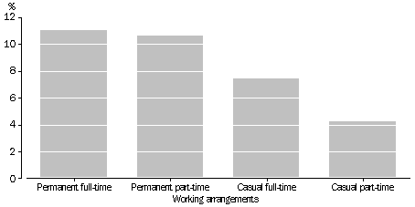 Sex and age Overall, men had a sick leave rate of 9% and women of 10%. However, male and female employment patterns are quite different. In 1995, 81% of male employees were permanent full-time compared to 54% of female employees. After standardising for working arrangements the male sick leave rate remained at 9% while the female rate increased to 11%, suggesting that women are more likely than men to take time off work for illness. The highest standardised sick leave rate (14%) was recorded for women aged 15-24. Men in this age group also had a high standardised rate (11%). This is consistent with the general finding that young workers have higher rates of workplace absence than older workers1. The difference between the male and female standardised sick leave rates is more than twice as high for those aged 15-44 as for those aged 45 and over. It is likely that child-bearing contributes to the higher rates for younger women. EMPLOYEES WHO TOOK SICK LEAVE, 1995