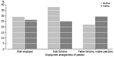 (b) Includes those for whom family status could not be determined. Source: Survey of Working Arrangements (unpublished data) Family responsibilities In recent decades more employees have chosen to combine employment and family responsibilities. Family responsibilities, such as caring for sick children, may contribute to workplace absence if an employed parent cannot make alternative care arrangements. Until recently this responsibility has been mainly associated with women because they have traditionally had the main responsibility for family care3. The 1993 Child Care Survey collected data on the child care arrangements made by parents when their children aged 0-11 were sick. Of the 703,000 couple families with children under 12 where both parents were employed, 410,000 had sick children in the six months to June 1993. 36% of the mothers and 16% of the fathers took time off work to care for their children. 29% of the mothers who took time off work and 26% of the fathers used their own sick leave. If fathers took time off they were most likely to use sick leave while mothers were most likely to use unpaid leave (34%). In the 147,000 families with sick children where both parents were employed full-time, 46% of the mothers and 23% of the fathers took time off work to care for the children. 38% of the mothers who took time off and 25% of the fathers used their own sick leave. In both cases sick leave was the most commonly used leave option. In 61% of families with sick children the father was employed full-time and the mother part-time. In such families 31% of the mothers and 12% of the fathers took time off work to care for the children. 22% of the mothers who took time off and 29% of the fathers used sick leave. Of employed lone parents, 63,000 had sick children in the reference period. Of the 46% who took time off work, 28% used sick leave to care for sick children. USE OF SICK LEAVE BY EMPLOYED COUPLES WHO TOOK TIME OFF WORK TO CARE FOR SICK CHILDREN, 1993 Source: Focus on Families: Work and Family Responsibilities (cat. no. 4422.0).Endnotes 1 Balchin, J. and Wooden, M. (1992) Absence penalties and the work attendance decision National Institute of Labour Studies Inc. Working Paper No. 120. 2 Survey of Employment Benefits, Australia (unpublished data). 3 VandenHeuval, A. (1995) Absence due to family responsibilities: an examination of explanatory factors National Institute of Labour Studies Inc. Working Paper No. 135.