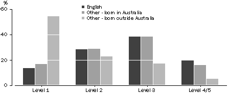 Of those whose first language was English, 14% were at Level 1 on the prose scale. The skill levels of people whose first language was not English, but who were born in Australia, were similar to those of people whose first language was English (17%). In contrast, of people whose first language was not English and who were born outside Australia, 55% had Level 1 prose skills.