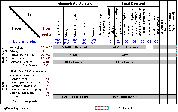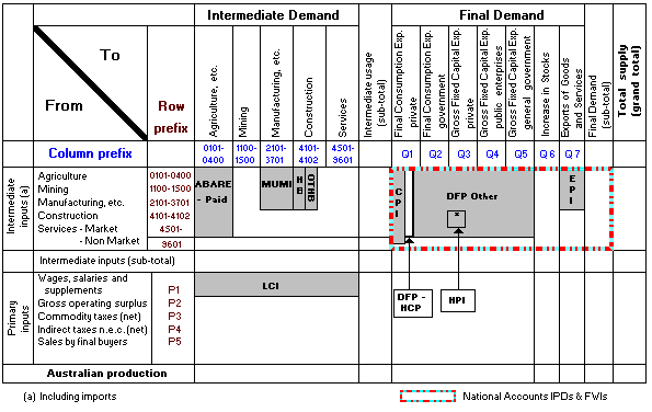 2.32. The interrelationships between each of the above price measures can be illustrated by reference to the framework used to produce the Australian Input Output tables. An Input Output absorption (or use) table has commodities and primary inputs in its rows, and using industries and final demand categories in its columns (see tables 2 and 3). It shows the flow of goods and services and the link from production to final demand.