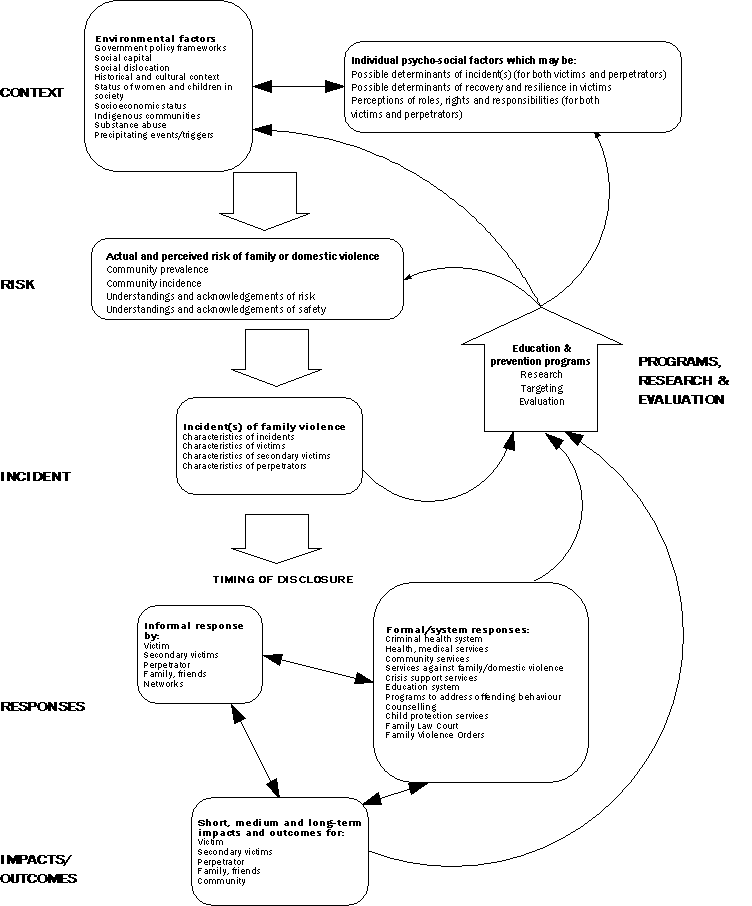 The Conceptual Framework for Family and Domestic Violence is summarised in Diagram 1 on page 13. It illustrates relationships between the key concepts and processes that exist between the elements and delineates these elements as: Context, Risk, Incident, Responses, Impacts and Outcomes, and Programs, Research and Evaluation.