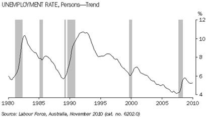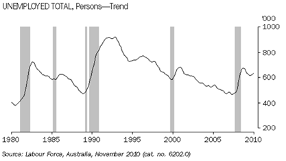 The ABS releases the count of the number of people employed each month in the measure, total employed persons. The number of employed persons in Australia has generally risen since the last major economic downturn in the early 1990s. Since 1978, the largest fall in employment occurred at this time, between June 1990 and December 1992, falling from 7,910,800 employed persons to 7,637,300, a decrease in employment of 273,500 persons (3.5%). For graphs in this article, the shaded areas indicate quarters where the percentage change in Gross Domestic Product (GDP - Chain Volume measure, Trend) was less than or equal to +0.2%, indicating the periods of slowing or declining economic growth. Source: Australian National Accounts: National Income, Expenditure and Product (cat. no. 5206.0). All graphs end at November 2010, to coincide with the latest available data.