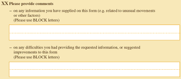 As well as catering to the technical requirements of the OCR scanning equipment, it is very important that (as with non-OCR forms) design standards are applied consistently throughout the form, primarily to make the form as easy as possible for the provider to complete and to maximise the quality of reported data.