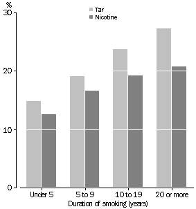 Source: National Health Survey Consumption patterns Although a smaller proportion of adults were smoking in 1989-90 compared to 1977, the cigarette consumption of those who smoked was greater. In 1977, 33% of male smokers smoked more than 20 cigarettes (the most common pack size at that time) a day. By 1989-90 the proportion had risen to 42%. For female smokers the proportional increase in daily cigarette consumption was even greater. Between 1977 and 1989-90 the proportion of female smokers smoking more than 20 cigarettes a day doubled from 14% to 28%. In 1989-90 daily cigarette consumption for both men and women was greater for 25-64 year olds than for younger and older age groups. The lower consumption level of people in the 18-24 years age group reflects the higher proportion of smokers in this group who have only recently taken up smoking. It is not clear whether the lower daily cigarette consumption of those aged 65 years and over reflects a decline in consumption in old age, a higher proportion of deaths of heavy smokers before 65 years of age or an age cohort with a lower cigarette consumption level throughout their life. The tar and nicotine content of cigarettes smoked varies according to both a person's age and the length of time they have been smoking. Among persons who had been smoking for less than 5 years, 15% smoked cigarettes with 14mg or more of tar compared to 27% of those who had been smoking for 20 years or more. However, it should be noted that this does not necessarily mean that smokers graduate to higher tar content cigarettes over time. It is likely that the majority of those who have been smoking for 20 years or more have always smoked medium to high tar cigarettes. Lower tar cigarettes have only become more widely available and more popular in recent years hence their prevalence among younger smokers. The pattern of nicotine content reflects the pattern of tar content because higher tar content cigarettes generally have higher levels of nicotine. Among those who had smoked for less than 5 years, 13% smoked cigarettes with 1.5mg or more of nicotine compared to 21% of those who had been smoking for 20 years or more. A greater proportion of men than women smoked cigarettes with 14mg or more of tar (30% compared to 17%) and with 1.5mg or more of nicotine (23% compared to 14%). PATTERNS OF TOBACCO USE OF ADULT CIGARETTE SMOKERS, 1989-90
