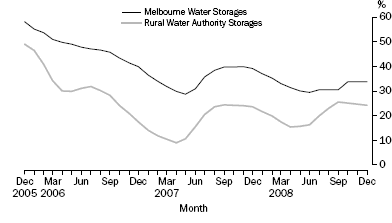 Melbourne's water storage level at the end of December 2008 was at 33.9% of capacity. This was the same level as in November 2008 and 5.3% lower than in December 2007. Rural water storages held 24.3% of their capacity at the end of December 2008, 0.5% lower than in November 2008, and 0.6% higher than the level in December 2007.