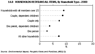 Australians who did not nominate the environment as their most important social issue were asked if they were concerned about environmental problems; in 1999 some 69% indicated that they were. The proportion of people expressing concern for the environment has declined slowly since 1992 (graph 14.3). People with higher incomes and more education are more likely to express concern for the environment (ABS 1996). However, higher household incomes can also increase environmental pressures because of the link between affluence and increased consumption of resources and waste production (Yencken and Wilkinson 2000). Donating time and money to environmental protection A study of the proportion of households donating time or money to environmental protection between 1992 and 1998 found an overall decline in the proportion in every State and Territory (graph 14.4). States and Territories that showed the largest falls were the Northern Territory (by 16%), the Australian Capital Territory (13%), Queensland (12%), and Western Australia (11%). New South Wales showed the smallest fall (5%) (Alle, Aravena and Henty 2001). The study also compared households located in the capital city of each State with those in the rest of the State (the comparison could not be done for households in the ACT and NT). It found that there were no large differences, in 1992 or 1998, in the proportions of households in the two categories donating time or money (graphs 14.5 and 14.6). Household waste management Household recycling Household solid waste is defined as waste from domestic premises; it includes household refuse, garden waste and other discarded materials, such as disused furniture. An important response to household waste is recycling. Household recycling has increased in Australia during the nineties: in 1992 around 85% of people recycled some items of waste; by 2000 this had risen to about 97%. Paper, old clothing, plastic bags and glass were the items most commonly recycled (graph 14.7). Only a small proportion of Australian households (just under 7% in March 2000) recycle all the waste items that can be recycled. While recycling rates have improved, more household waste still goes to landfill than is recycled; an audit in 1997 found that the average Australian household produced 15.7 kg of waste for collection each week (Beverage Industry Environment Council 1997). This comprised 11.9 kg of garbage, 3.1 kg of recyclables, 0.2 kg of contaminants and 0.5 kg of green waste. Recycling behaviour in Australia is different for different types of households. For example, one person households recycle less than all other types of households (graph 14.8). The most common reason provided by the 93% of Australian households that did not fully recycle in 2000 was a lack of recyclable materials in their waste (around 73% of the households not fully recycling). The next most common reason cited by households was the absence of recycling services or facilities; households from the Northern Territory were the most likely to select this reason for not fully recycling (graph 14.9). Only a small proportion of households (around 3%) in Australia recycled no waste items at all in 2000; this proportion has fallen in every State and Territory since 1992 (graph 14.10). National targets for minimisation of solid waste While recycling of solid waste by households is important, waste minimisation by all sectors has been seen by policy makers as the key to reducing the environmental pressures arising from solid waste going to landfill. In 1990 the Australian and New Zealand Environment and Conservation Council set a national target of a 50% reduction in waste going to landfill by the year 2000, based on 1990 per capita levels. This target has not been met, and it is possible that the levels of waste going to landfill have not been reduced at all (the uncertainty stems from a lack of consistent national data) (Chalkley Consulting and Global Environmental Consulting 2000). Estimates of household waste produced in Australia in the early nineties were around 400 kg per person per year (OECD 1999). Total solid waste going to landfill in Australia in 1996-97, however, was around 1,100 kg per person per year (total solid waste includes waste associated with councils servicing residential areas as well as commercial, industrial, construction and demolition waste) (ABS 1998). As the construction and demolition industries are thought to generate up to 40% of all solid waste going to landfill in Australia, businesses in these industries, in partnership with government, have initiated and funded their own improvements to solid waste management (Environment Australia 2000). Assessing the performance of the household sector in waste minimisation remains problematic. Household hazardous waste Households accumulate hazardous waste, such as garden chemicals and paint products. In 2000 a smaller proportion of households (21%) took their household hazardous waste to a dump or central collection point than in 1996 (30% of households). This decline was despite an increase in households' awareness of the availability of facilities in their area for the safe disposal of household hazardous waste (37% awareness in 2000 compared to 31% in 1996).