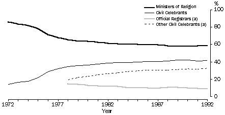 Although over half of all weddings in 1992 were performed by ministers of religion, the proportion has steadily declined, from 86% in 1972 to 66% in 1978 and 58% in 1992. Most of this shift towards civil marriage occurred in the 1970s and can be attributed to the Commonwealth Government's introduction, in 1973, of authorised private civil celebrants to provide an alternative to religious ceremonies and State Registry weddings.