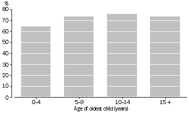 Households with young children (aged 0-4) only were less likely to keep pets than households with school-age children. The proportion of households with pets generally increased with the age of the oldest child. Three-quarters of households where the oldest child was aged 10-14 kept pets.